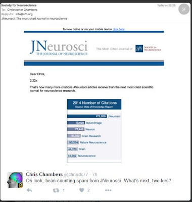 Yesterday Chris Chambers was outraged to receive marketing spam from Journal of Neuroscience, boasting that articles published in their journal received many more citations than those published in their competitors.